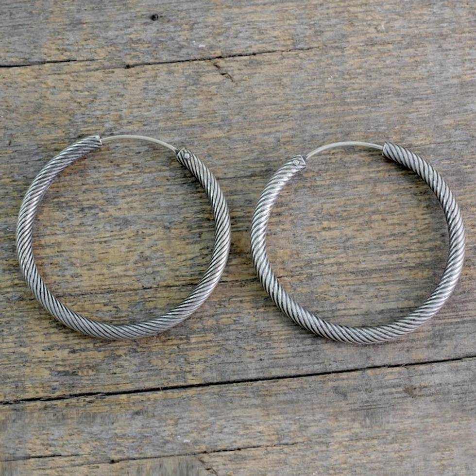 "Timeless sterling silver hoop earrings get an upgrade with a lightly-oxidized spiraling twist pattern. Mahavir in India presents the original endless hoop design, which can be worn anywhere and with anything."