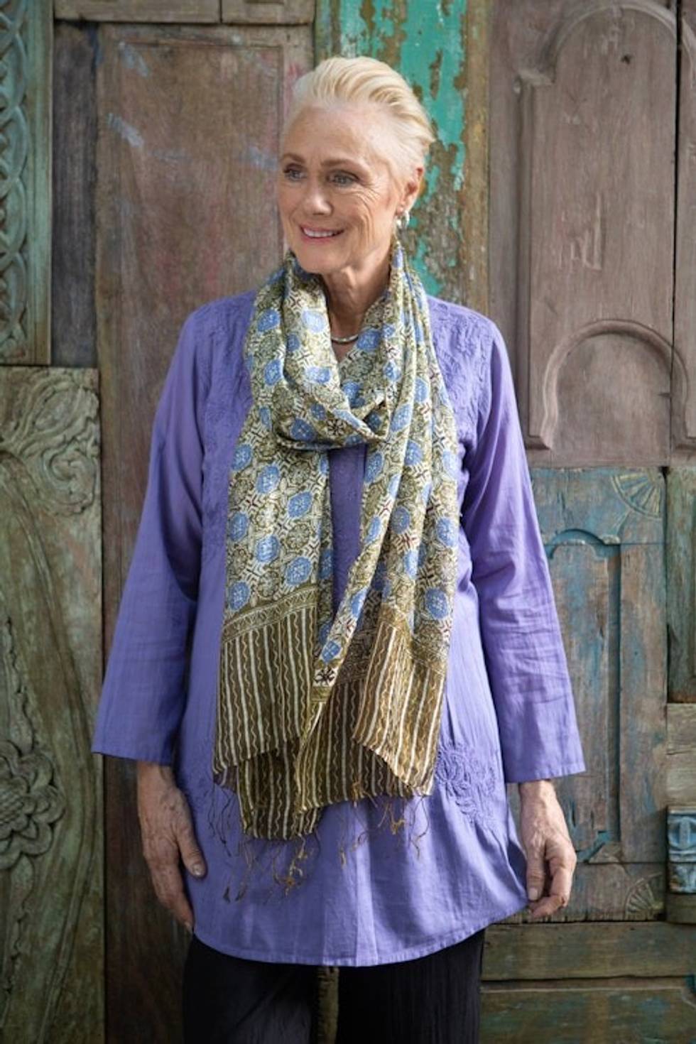 This absolutely gorgeous shawl is made from some of the finest silk I've ever had the privilege to touch. It is so soft and light, yet sturdy and the batikking is impeccable! I love the black version, as it shows up the print so beautifully! It almost has a vintage Arts and Crafts feel to the pattern. Nice enough to display in one's home - the bedroom perhaps...? I have since thought of getting another color either for myself or a very good friend or family member...well worth it.