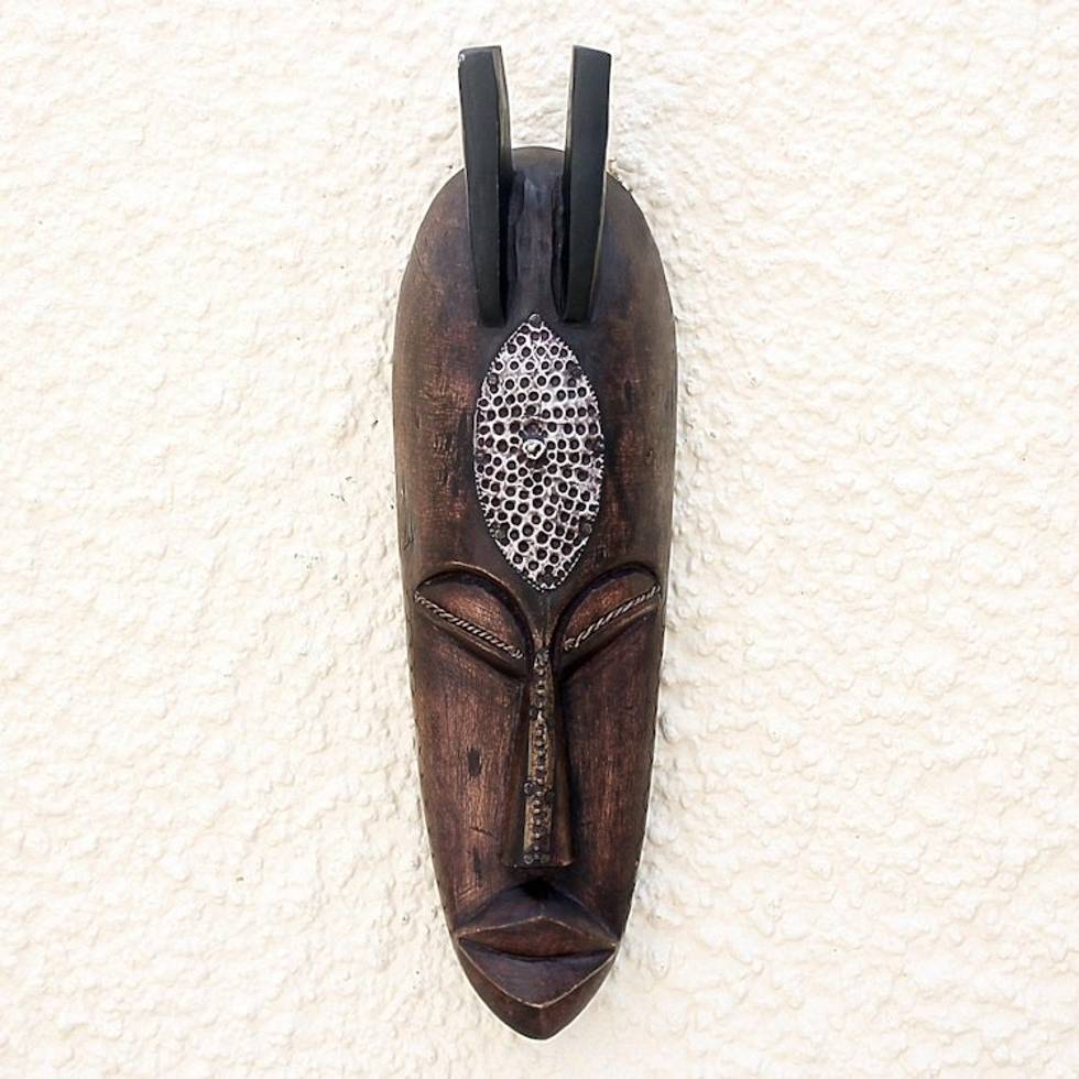 "Horns crown the narrow face of an African king. Carved with only hand tools from naturally-dried sese wood, the piece slopes dramatically from a smooth forehead to a pointed chin; a slim nose elongates the visage. Designer Nana Adu Amankwapam commemorates Tufu Baule, king of the Baoule people of Cote d'Ivoire. Known as a peace lover, Tufu's portrait masks are often displayed in homes."