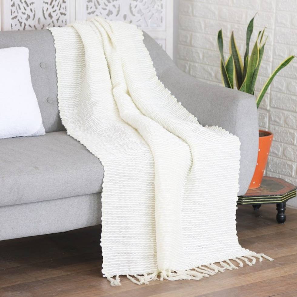 Ivory Acrylic Thread Throw Blanket with Striped Pattern 'Ivory Caress' Item ID: 2669892190