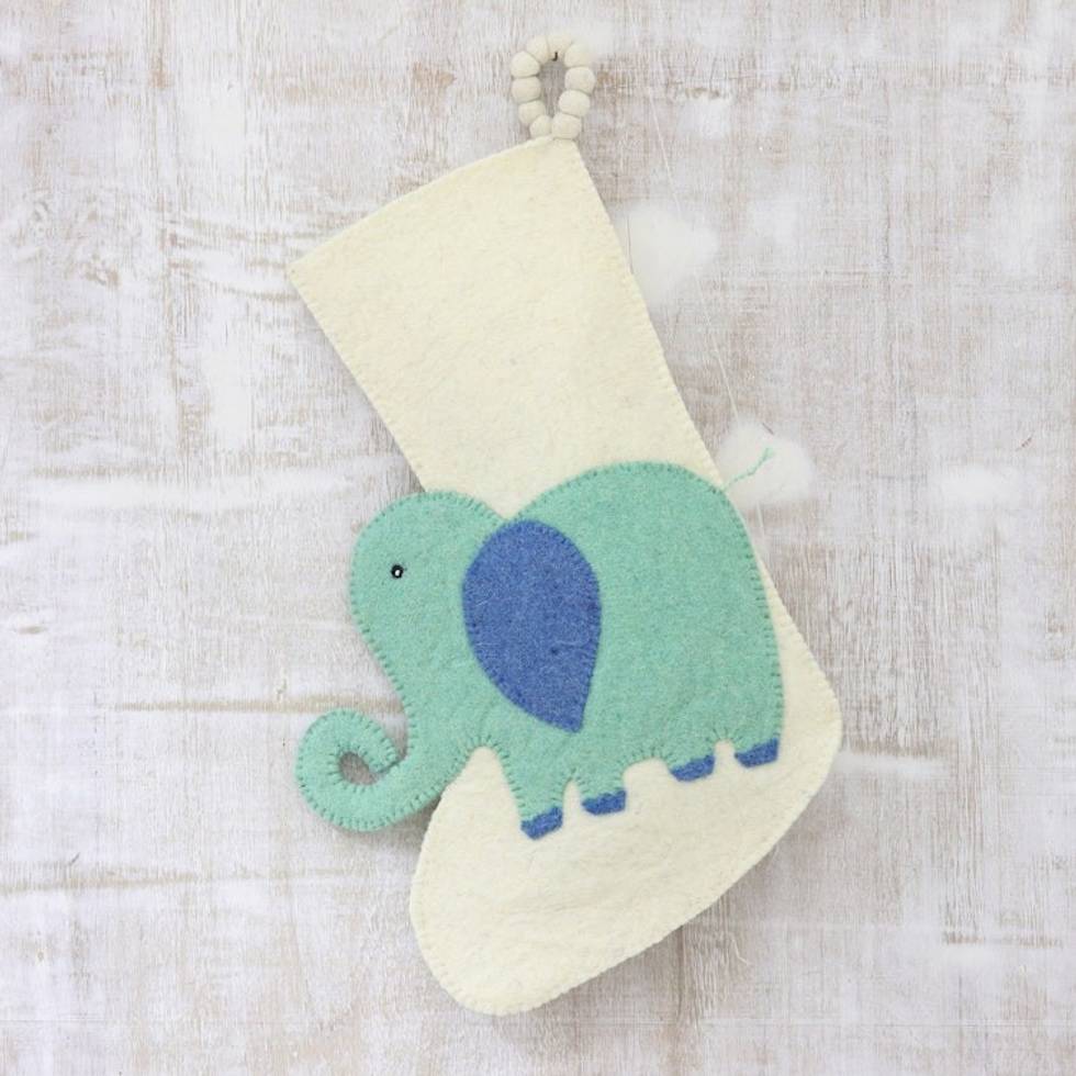 Ivory Wool Felt Elephant Christmas Stocking 'Holiday Elephant in Aqua' Item ID: 2671792909