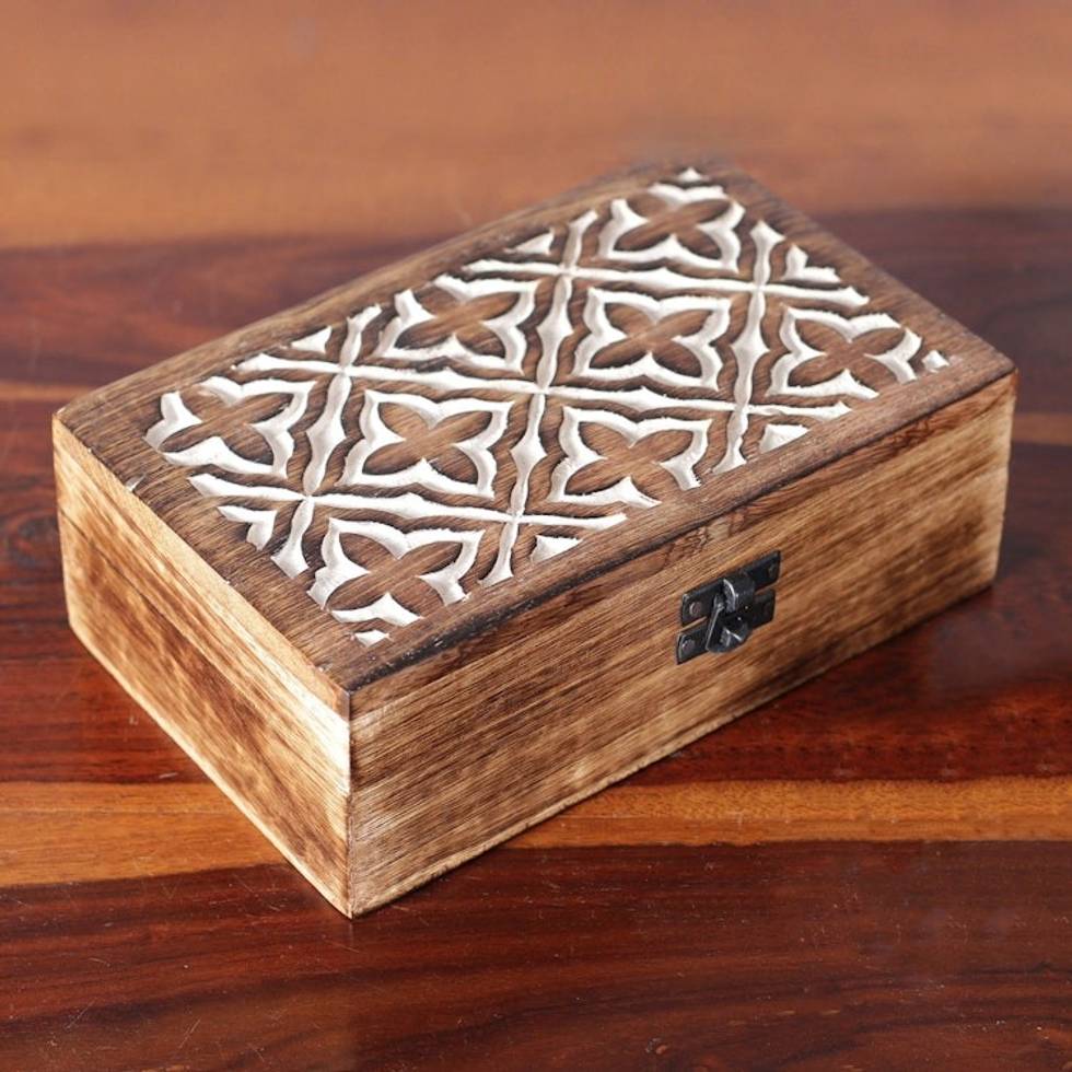 Jaali-Inspired Floral Rectangular Mango Wood Decorative Box 'Floral Portal' Item ID: 2671781250