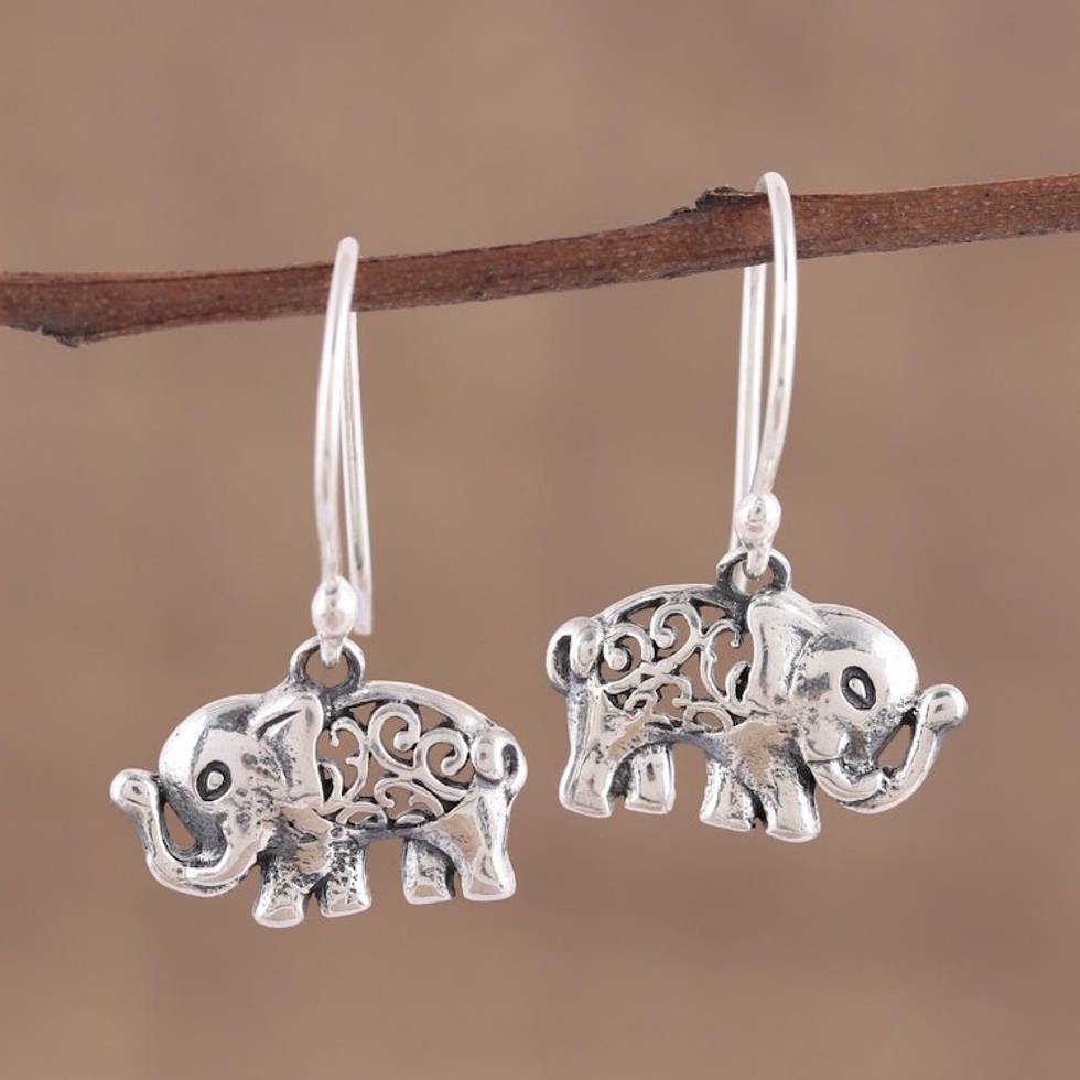 Jali Motif Sterling Silver Elephant Dangle Earrings 'Elephant Appeal' Item ID: 2669944171