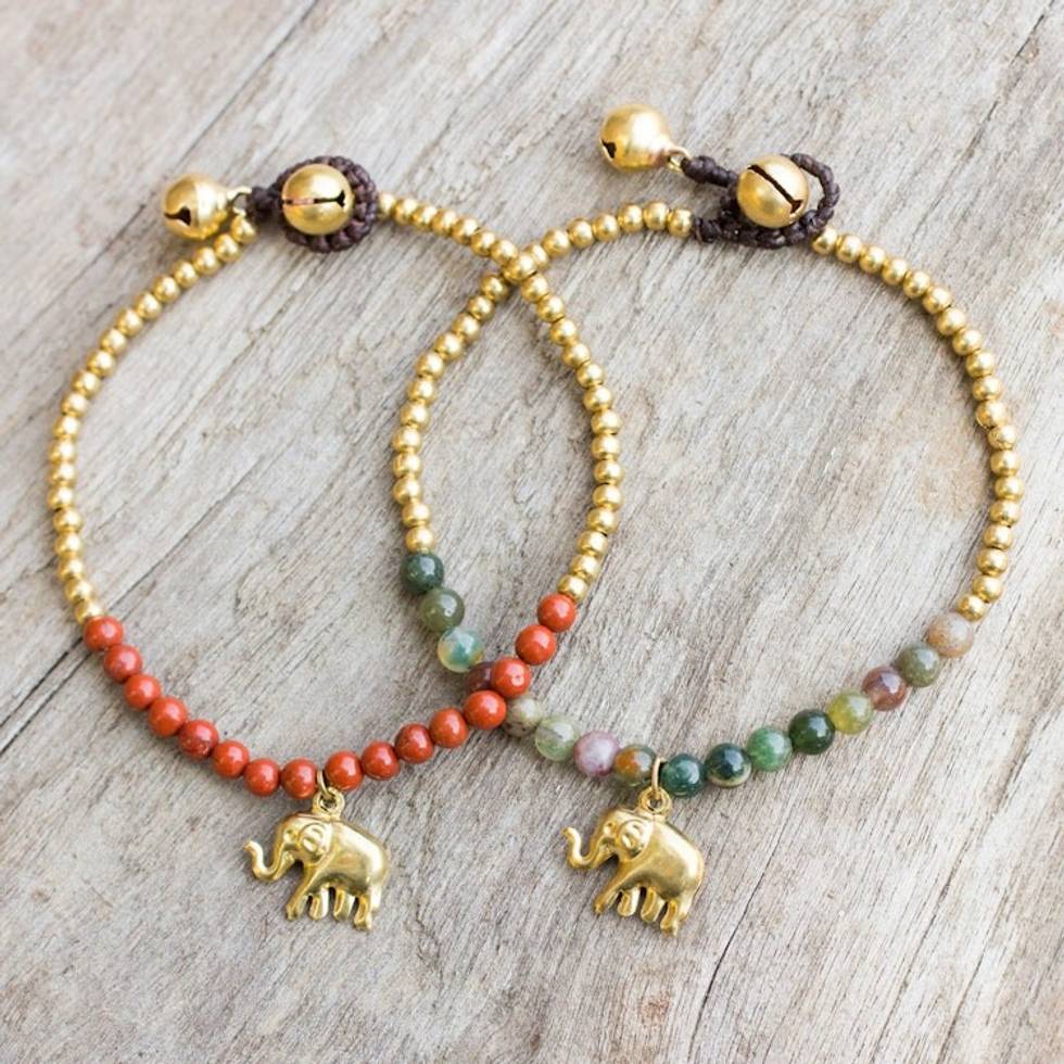 Jasper and Elephant Charm on Pair of Brass Beaded Bracelets 'Stylish Elephants' Item ID: 2671801822