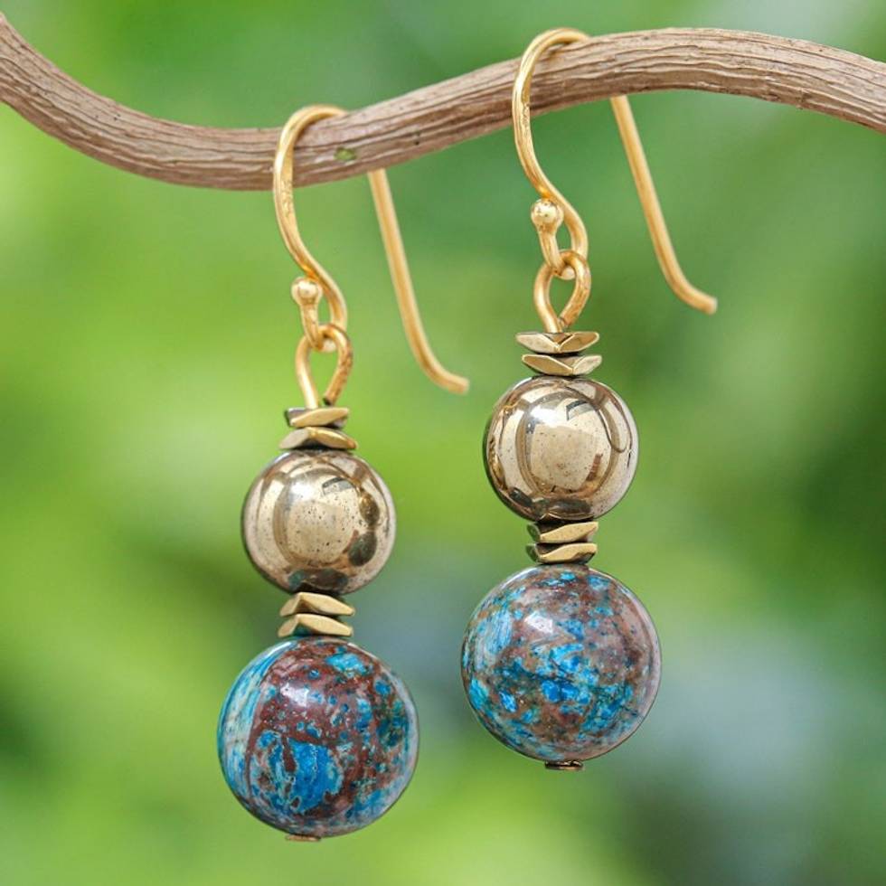 Jasper and Hematite Dangle Earrings with Gold Accented Hooks 'Golden Planet' Item ID: 2671798131