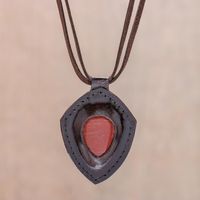 Jasper and Leather Pendant Necklace from Thailand 'Bold Shield' Item ID: 2671798306