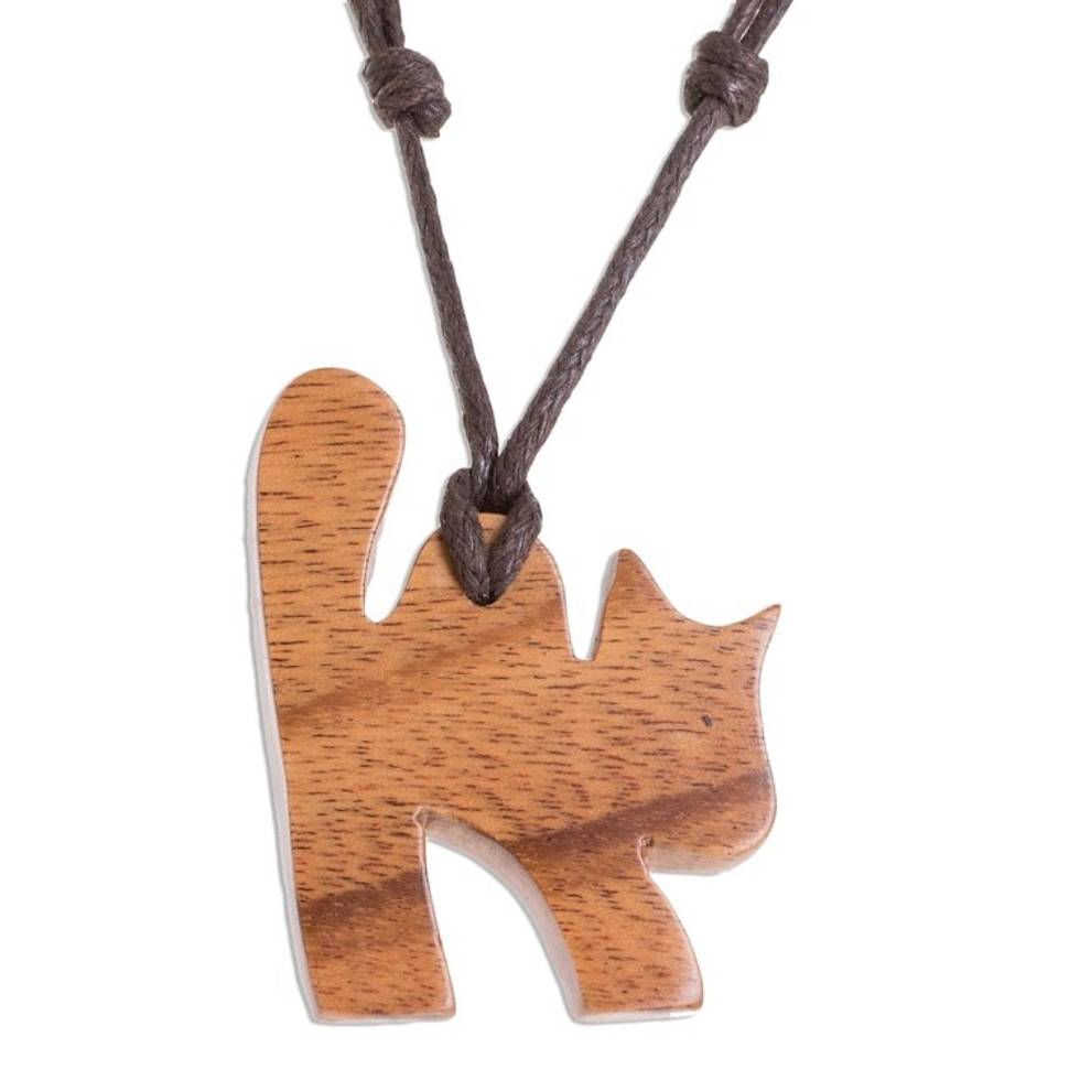 "Arching its back, a charming cat is hand-carved from a beautiful piece of jobillo wood, forming the pendant of this necklace from Costa Rica. Milagro Cascante designs and crafts this necklace, which circles the neck with an adjustable length of cotton cord."