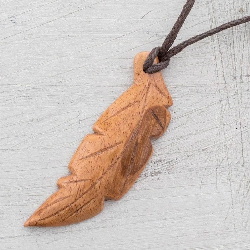 Jobillo Wood Feather Pendant Necklace from Costa Rica 'Jobillo Free Feather' Item ID: 2671777213