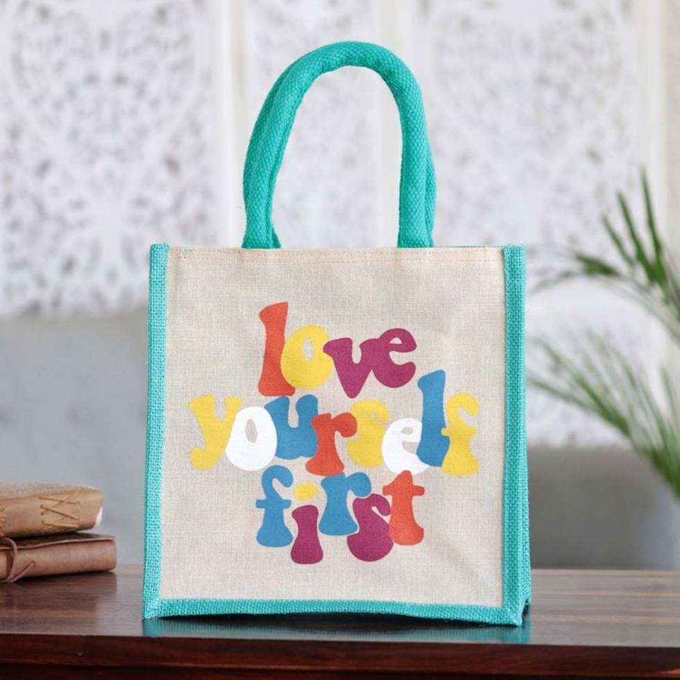 Jute and Cotton Blend Tote Bag Hand Crafted in India 'Love Yourself First' Item ID: 2671787323