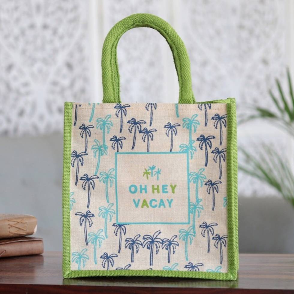 Jute and Cotton Blend Tote Bag Hand Crafted in India 'Oh Hey Vacay' Item ID: 2671789156