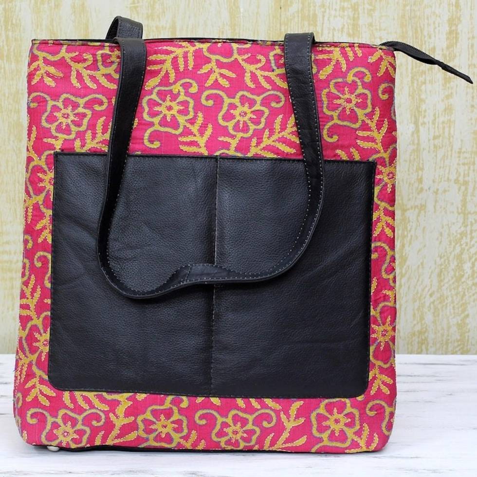 Kantha Embroidered Silk Shoulder Bag in Deep Rose from India 'Deep Rose Festivity' Item ID: 2671793599