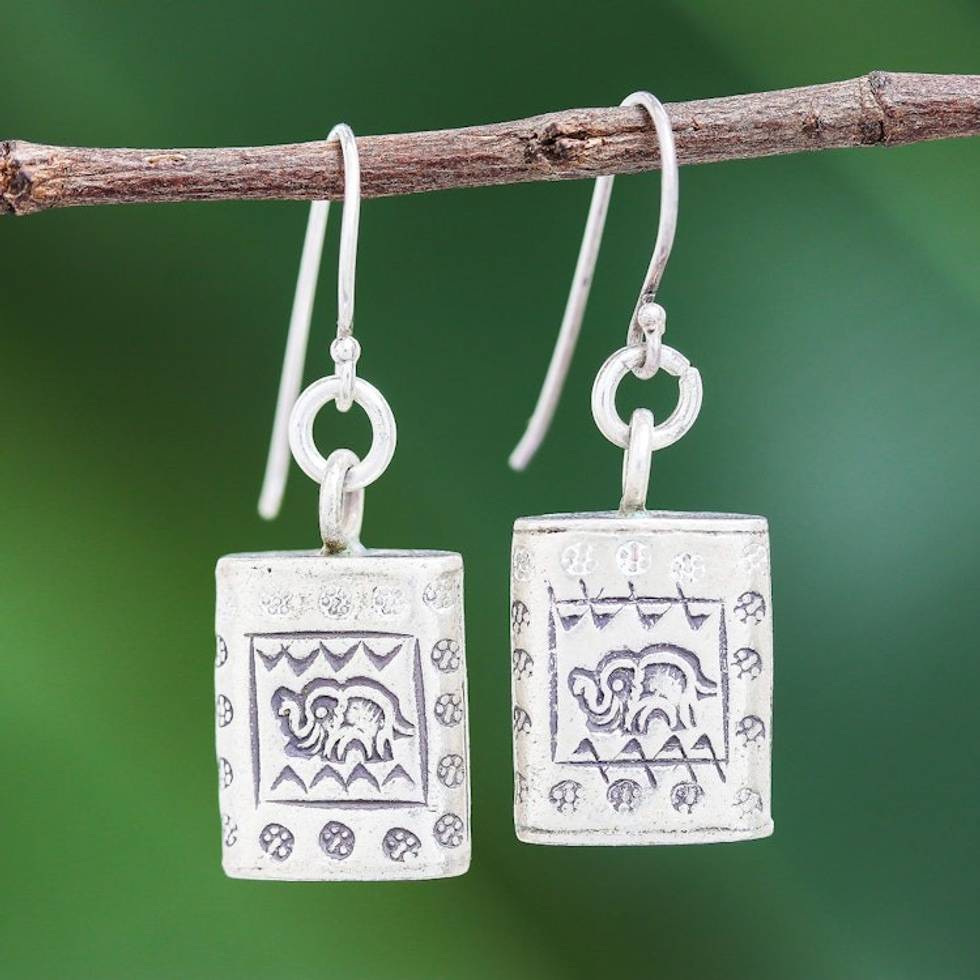 Karen Hill Tribe Silver Elephant Motif Block Dangle Earrings 'Honored Elephant' Item ID: 2671799515