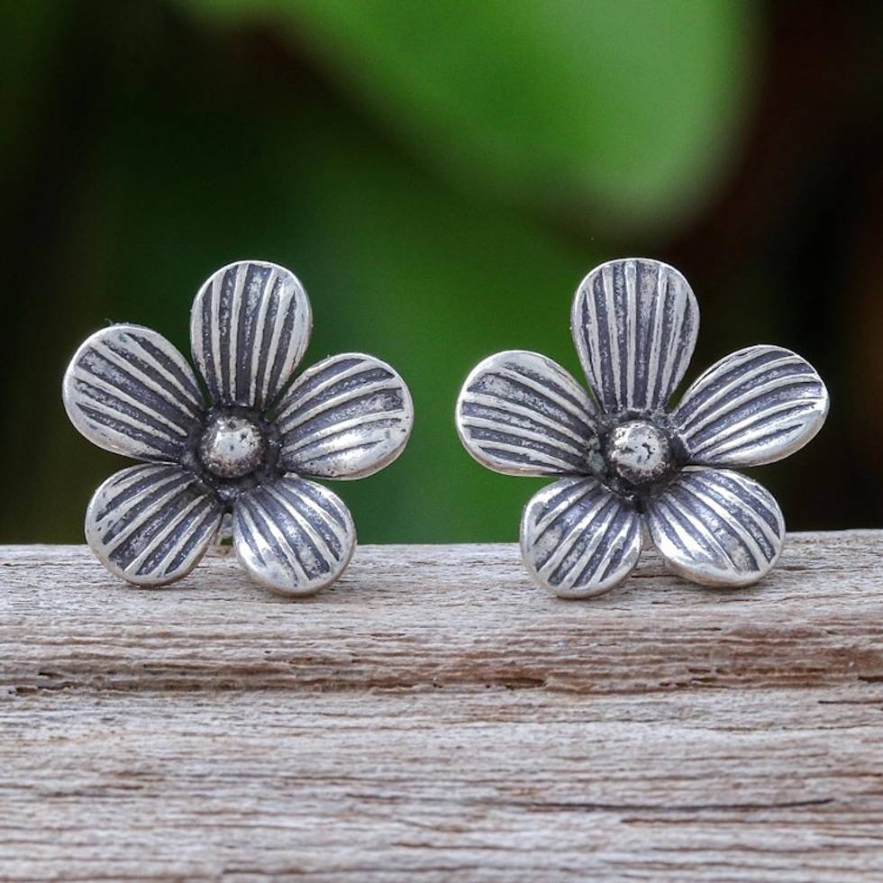 Karen Silver Floral-Motif Button Earrings 'Striped Garden' Item ID: 2671799707