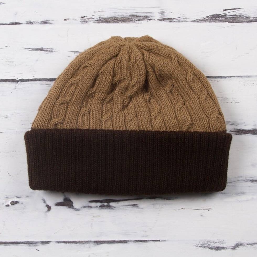 Knit 100 Alpaca Hat in Tan and Mahogany from Peru 'Warm Braids in Tan' Item ID: 2671695477