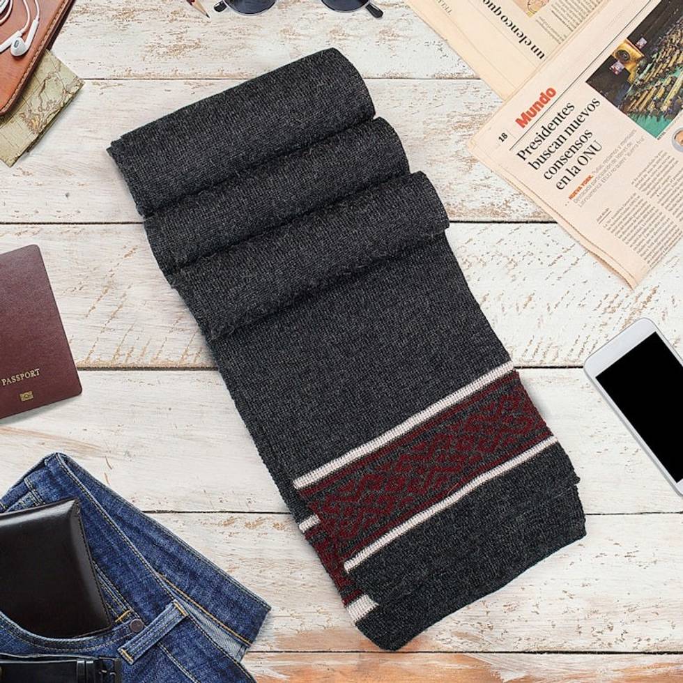 Knit Grey Red White 100 Baby Alpaca Scarf with Inca Motifs 'Andean Life' Item ID: 2671698120