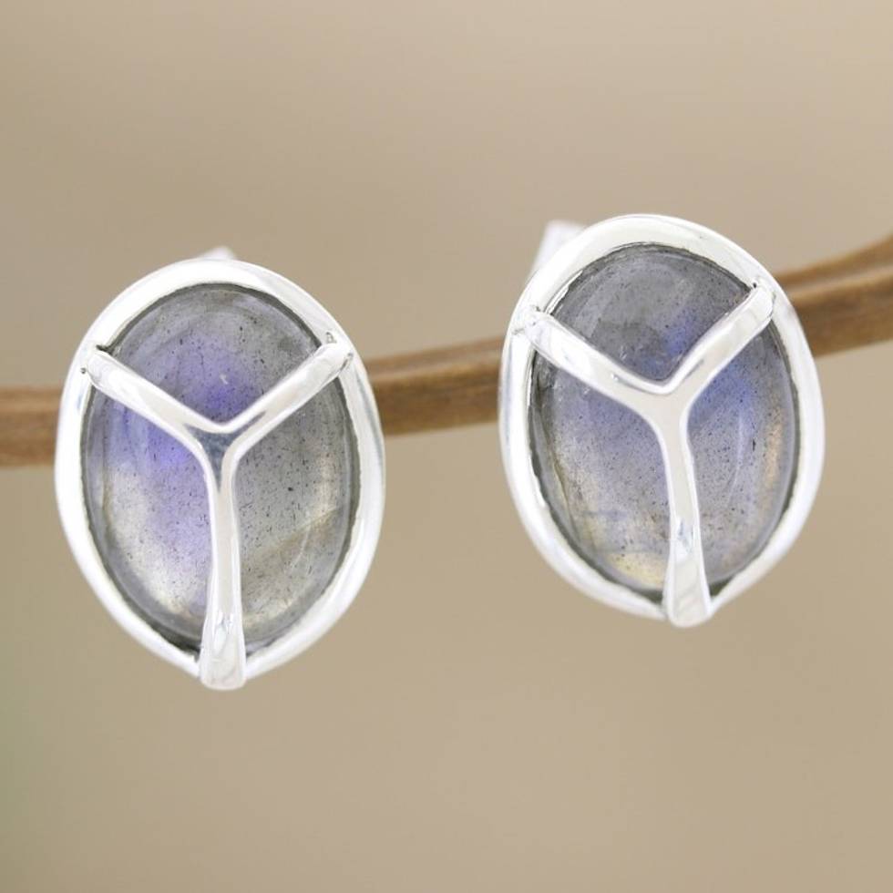 Labradorite and Button Earrings with Peace Sign Motif 'Make Peace in Grey' Item ID: 2671788511