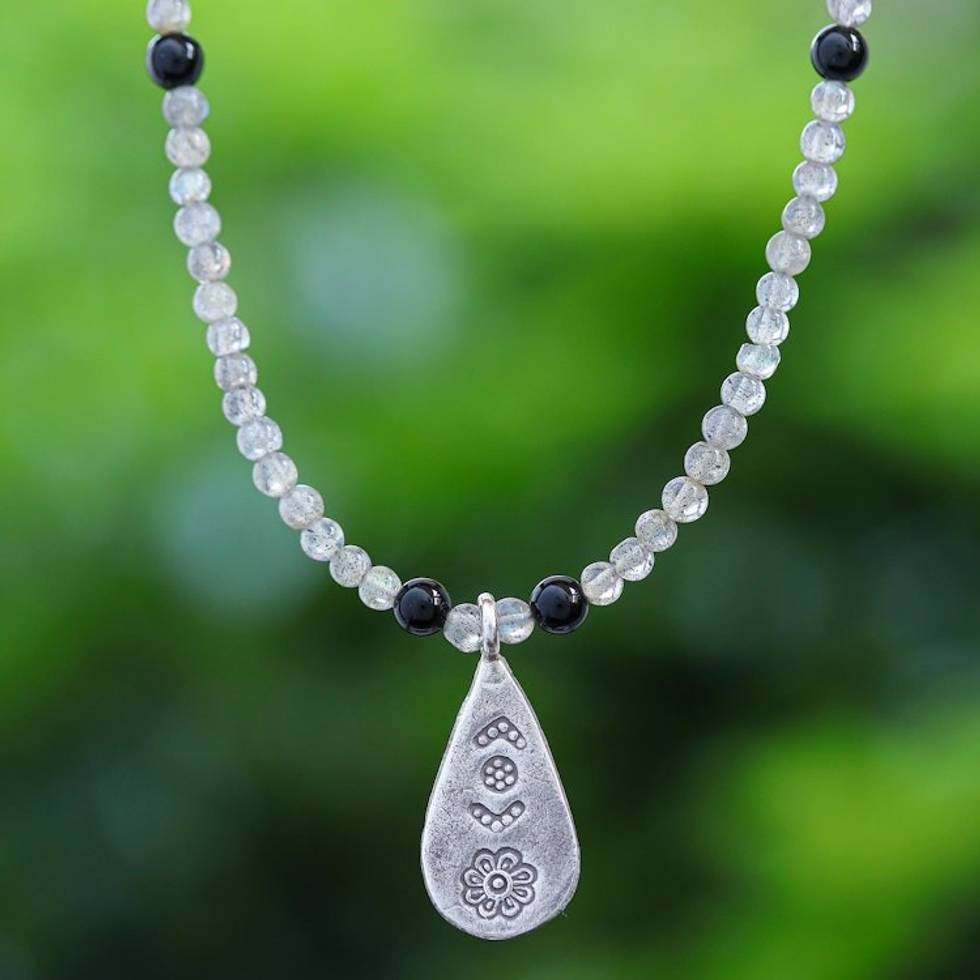 Labradorite and Onyx Pendant Necklace from Thailand 'Charming Flower' Item ID: 2671801323