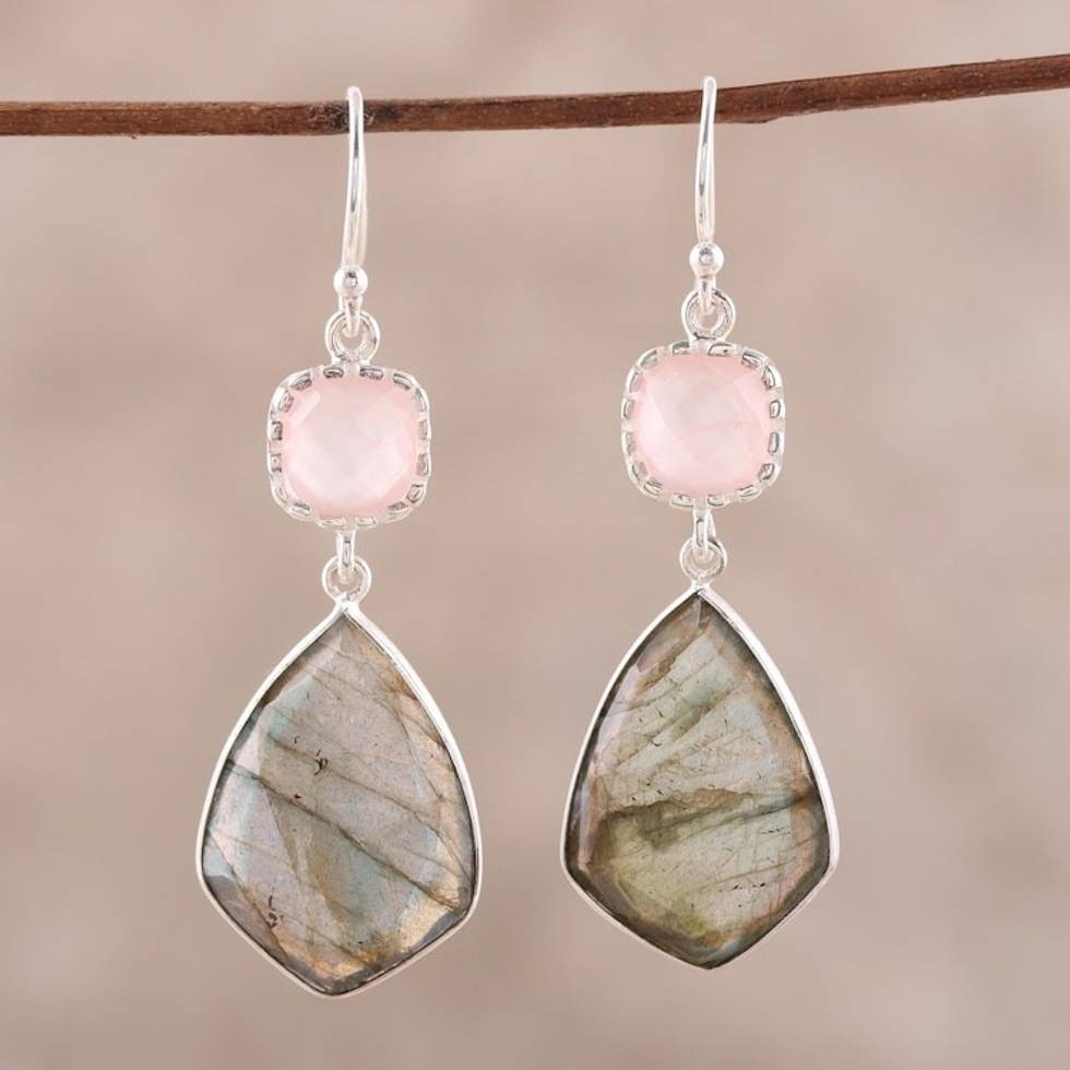 Labradorite and Rose Quartz Dangle Earrings from India 'Aurora Sophistication' Item ID: 2671792661