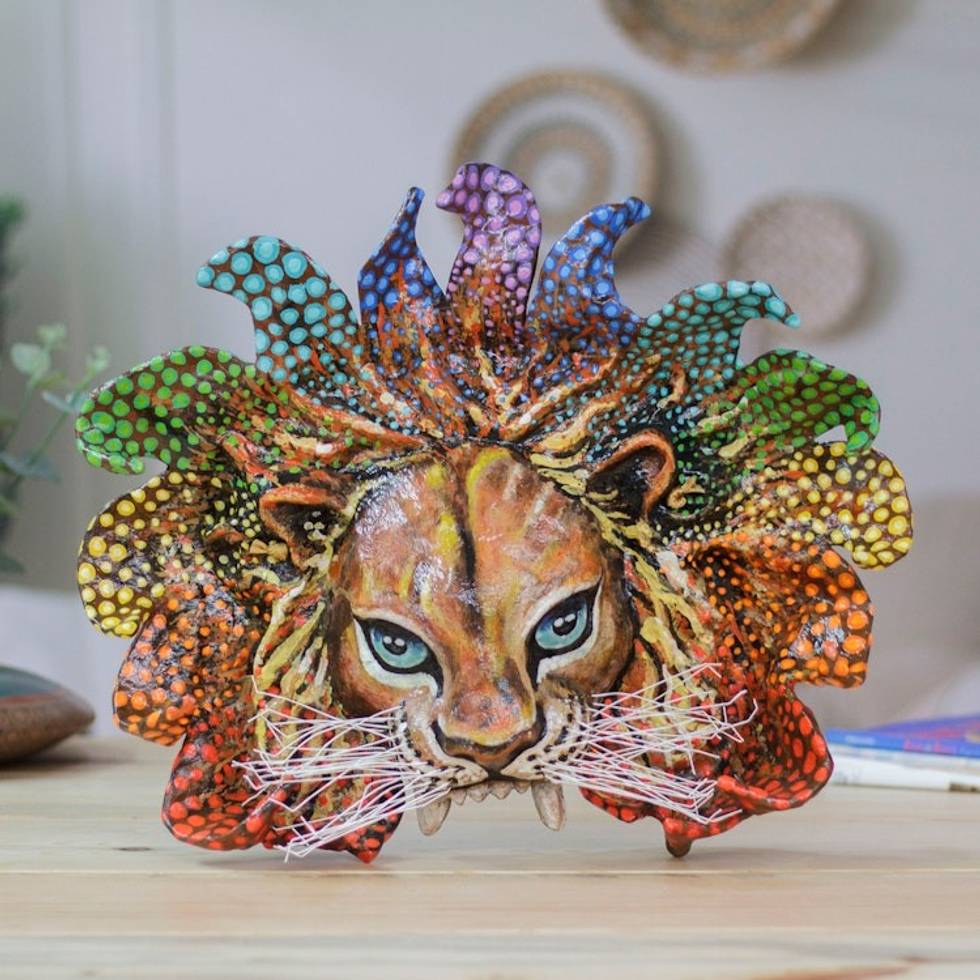 Lacquered Hand-Painted Lion Papier Mache Mask from Mexico 'Colorful Lion' Item ID: 2671807832
