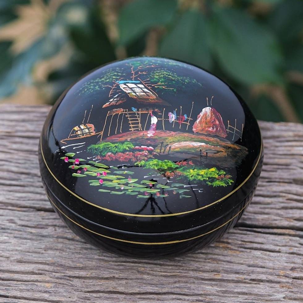 "A Thai landscape comes into sharp relief against a dark background on Subin Tositarat's gorgeous lacquerware box. Thai artisans hand carve the decorative box from mango wood, coating the surface in glossy black lacquer before painting the countryside scene in bright colors."