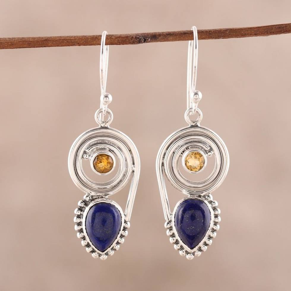 Lapis Lazuli and Citrine Dangle Earrings from India 'Wondrous Coil' Item ID: 2671792575