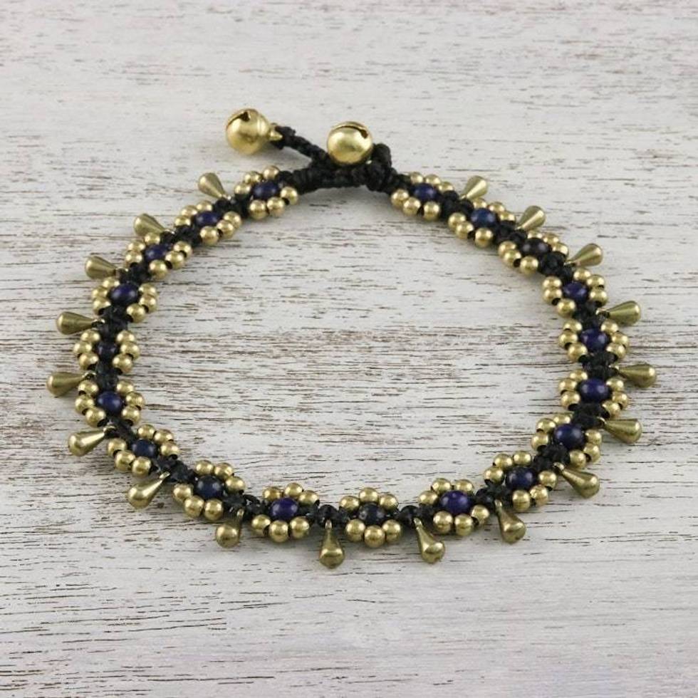 Lapis Lazuli Beaded Anklet with Bells from Thailand 'Elegant Rain' Item ID: 2676649319