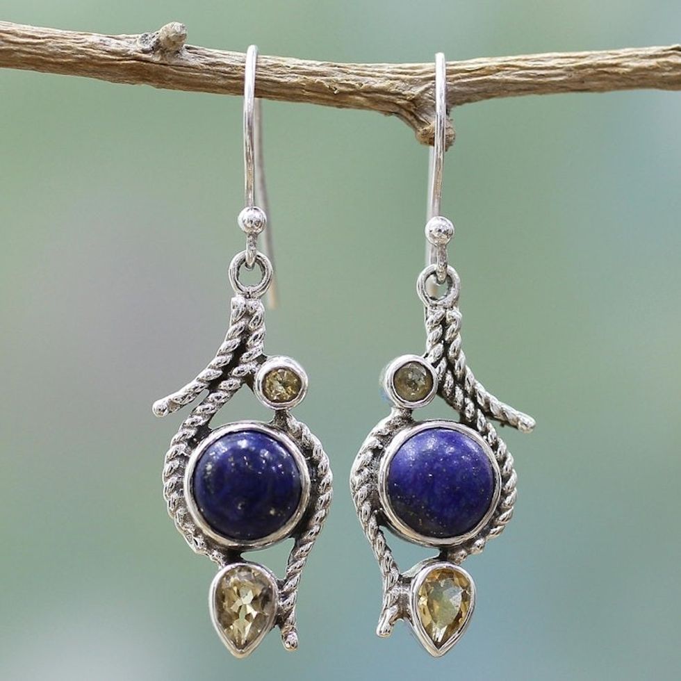 Lapis Lazuli Citrine Sterling Silver Dangle Earrings India 'Starry Bliss' Item ID: 2671793035