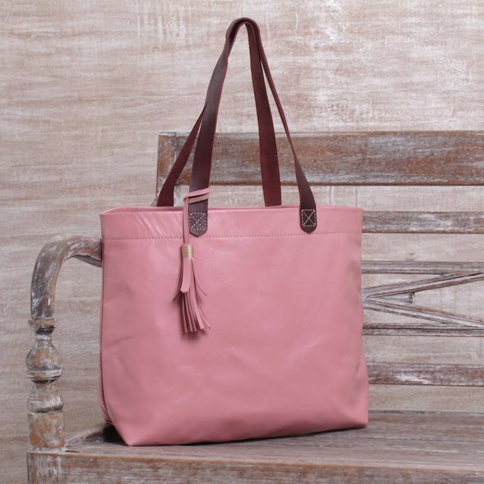 Large Indonesian Hand Crafted Pink Leather Tote Bag 'Balinese Abundance' Item ID: 2671734088
