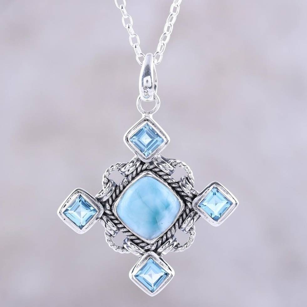 Larimar and Faceted Blue Topaz Pendant Necklace from India 'Dazzling Sky' Item ID: 2671620359