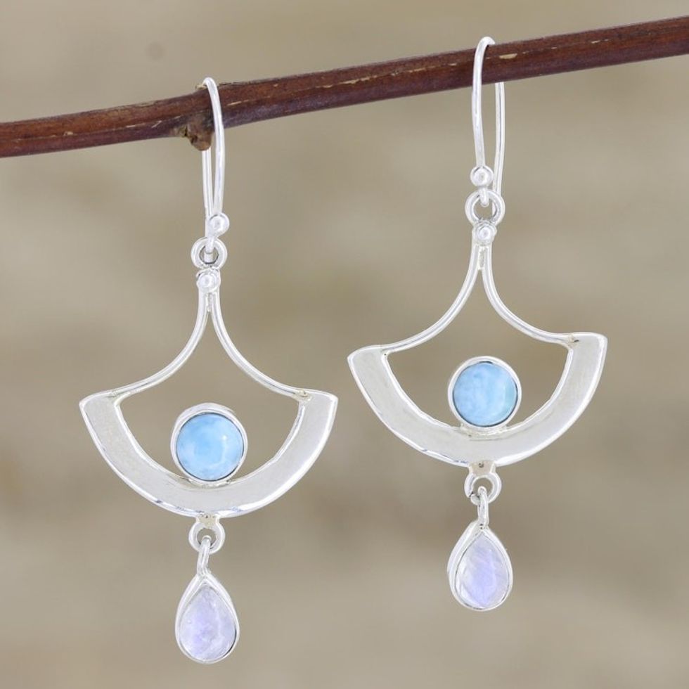 Larimar and Rainbow Moonstone Dangle Earrings 'Sky Chandelier' Item ID: 2669943910