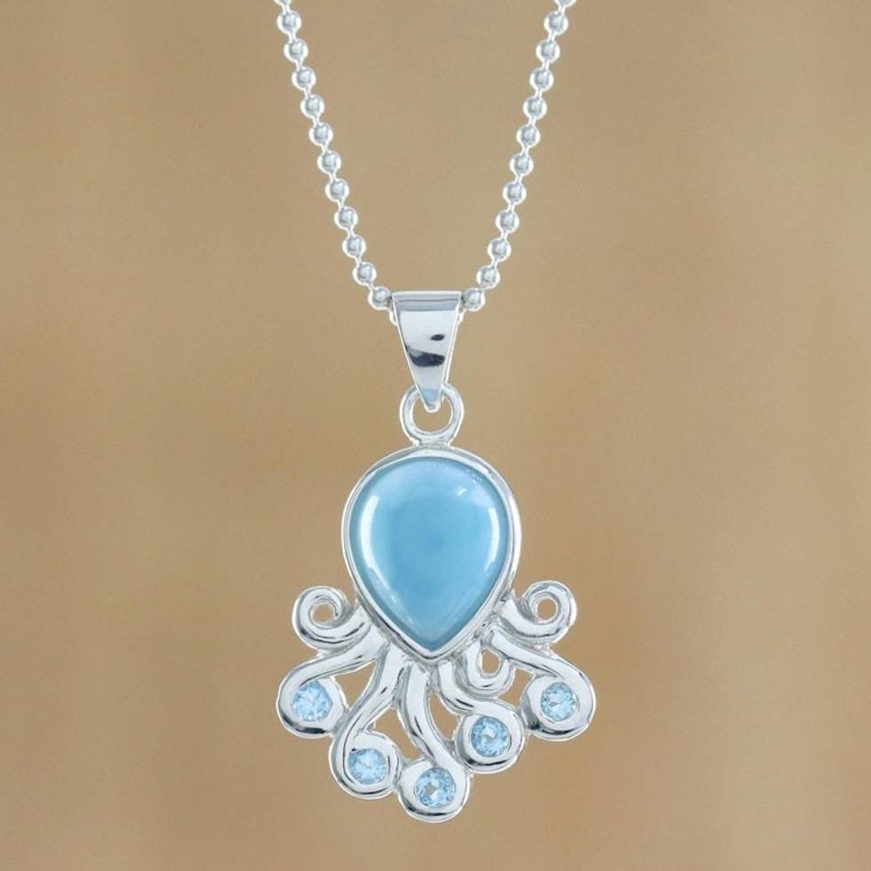 Larimar Blue Topaz Octopus Sterling Silver Pendant Necklace 'Sweet Octopus' Item ID: 2671641343