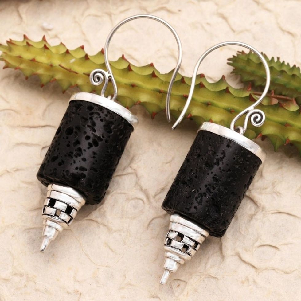 Lava Stone and Sterling Silver Dangle Earrings 'Stupa Pillar' Item ID: 2671746451
