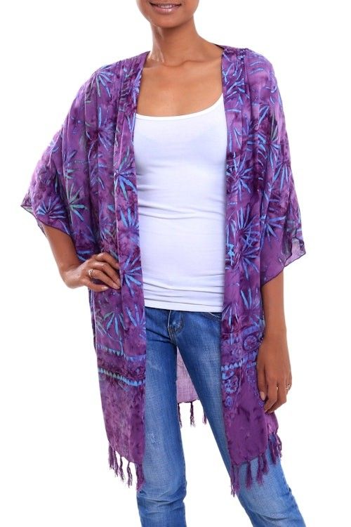 Leaf Motif Batik Rayon Kimono Jacket in Wisteria from Bali 'Denpasar Lady in Wisteria' Item ID: 2671820865