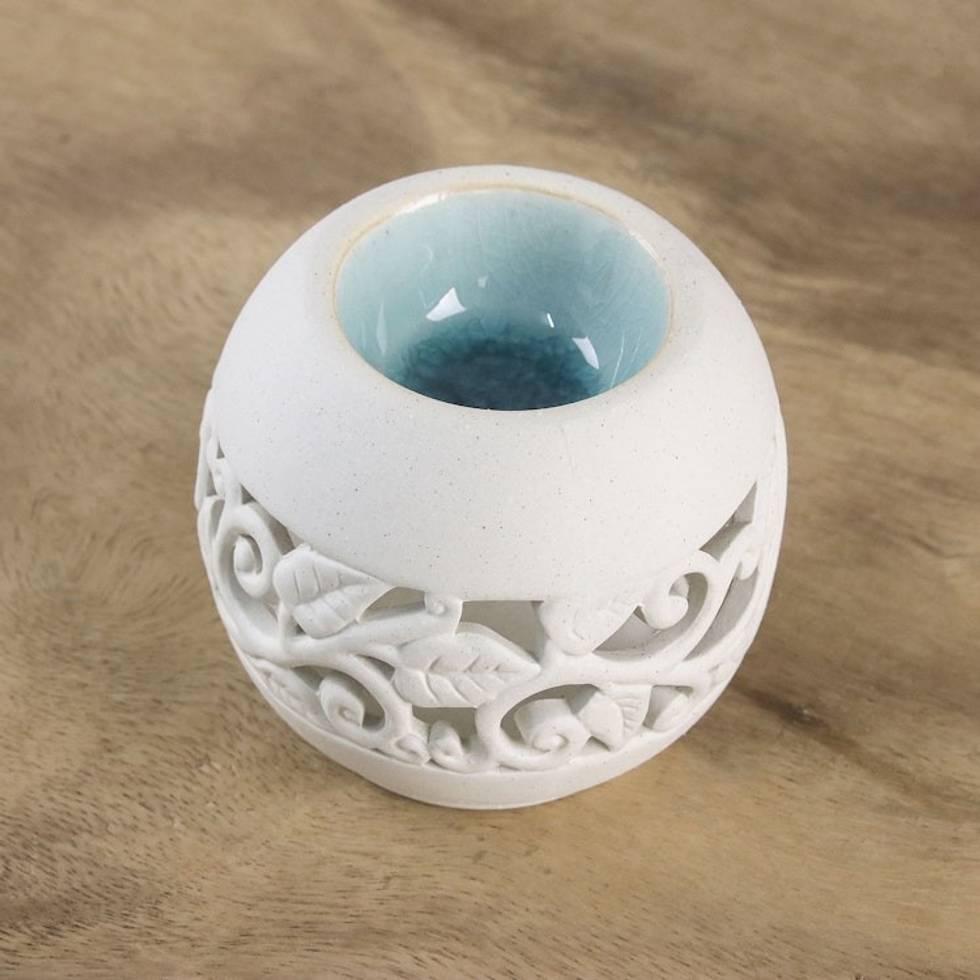 Leaf Motif Ceramic Oil Warmer from Thailand 'Charming Ivy in Blue' Item ID: 2669894215