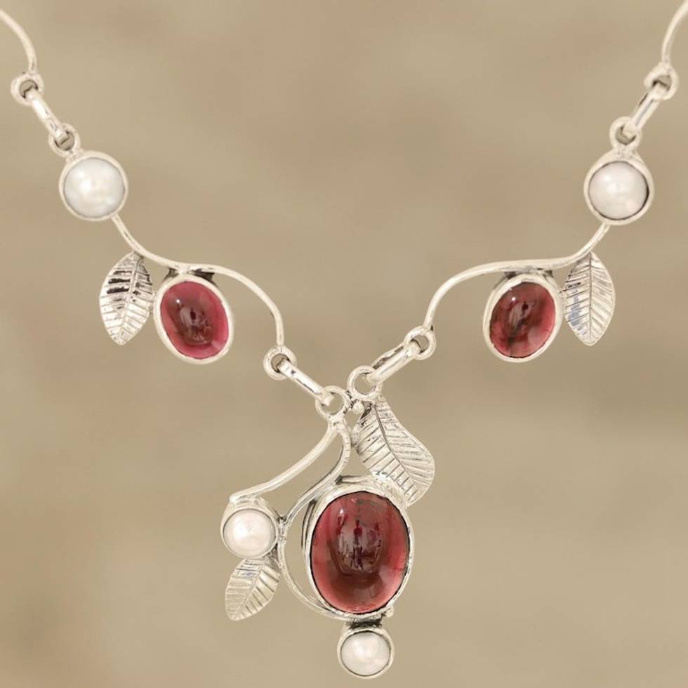 Leaf Motif Garnet and Cultured Pearl Necklace from India 'Enthralling Beauty' Item ID: 2671620241