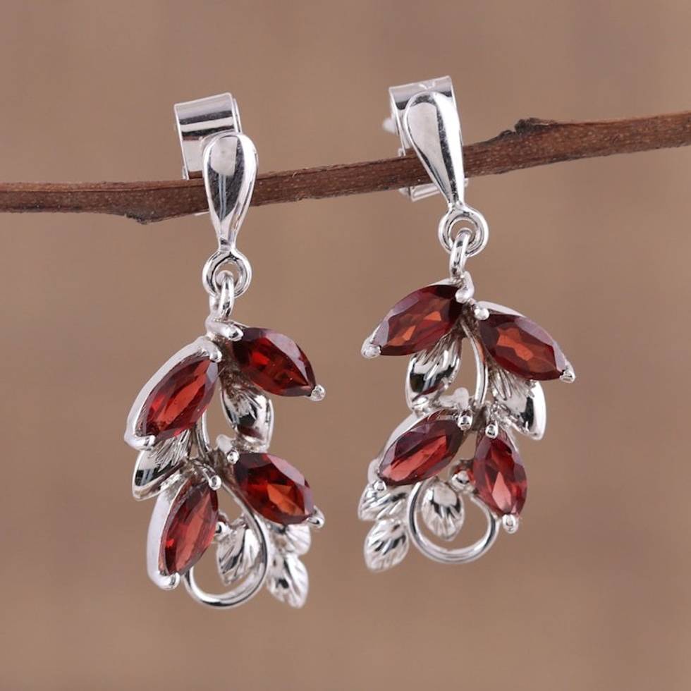 Leaf Motif Garnet Dangle Earrings from India 'Scarlet Charm' Item ID: 2671790580