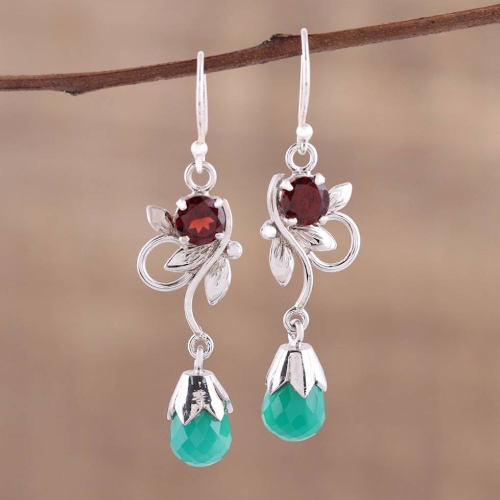 Leaf Motif Green Onyx and Garnet Earrings from India 'Lost in Romance' Item ID: 2671790863