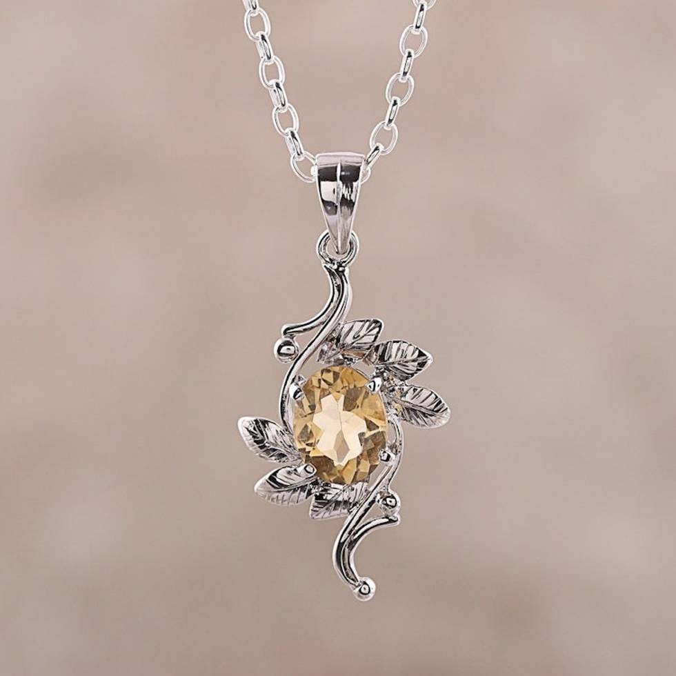 Leaf Motif Rhodium Plated Citrine Pendat Necklace from India 'Forest Radiance' Item ID: 2671619785