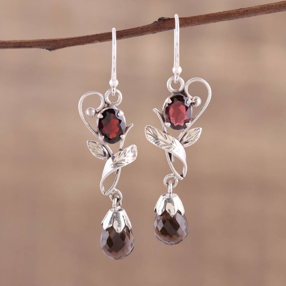 Leaf Motif Smoky Quartz and Garnet Earrings from India 'Dusk Romance' Item ID: 2671791096