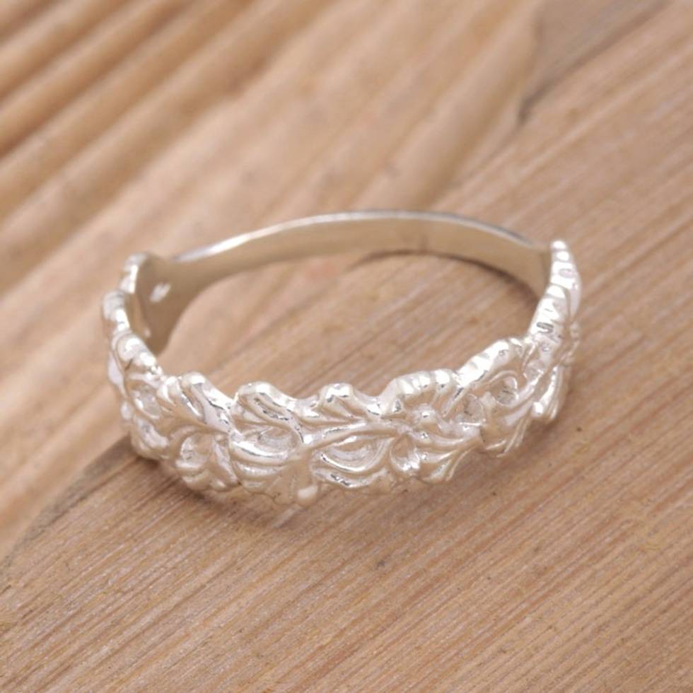 Leaf Motif Sterling Silver Band Ring Crafted in Bali 'Snow Flower' Item ID: 2671747926