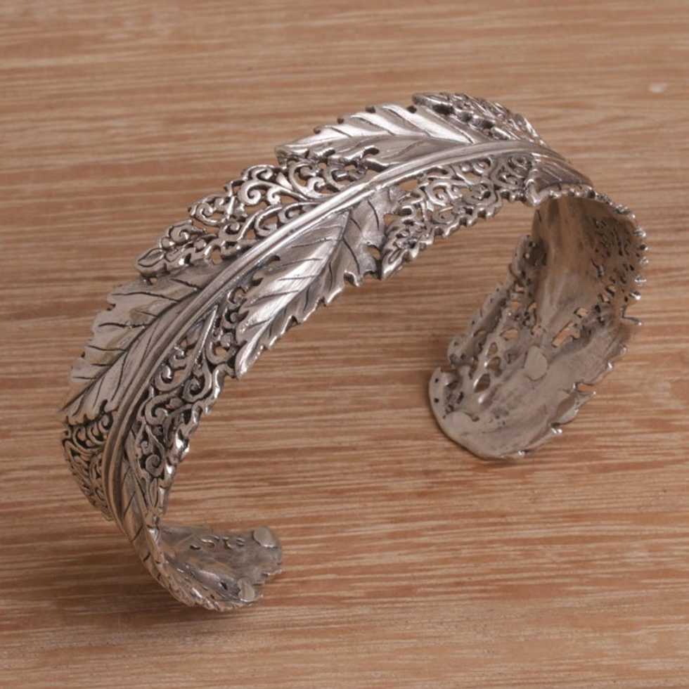 Leaf Motif Sterling Silver Cuff Bracelet from Bali 'Flawless Leaves' Item ID: 2669956386
