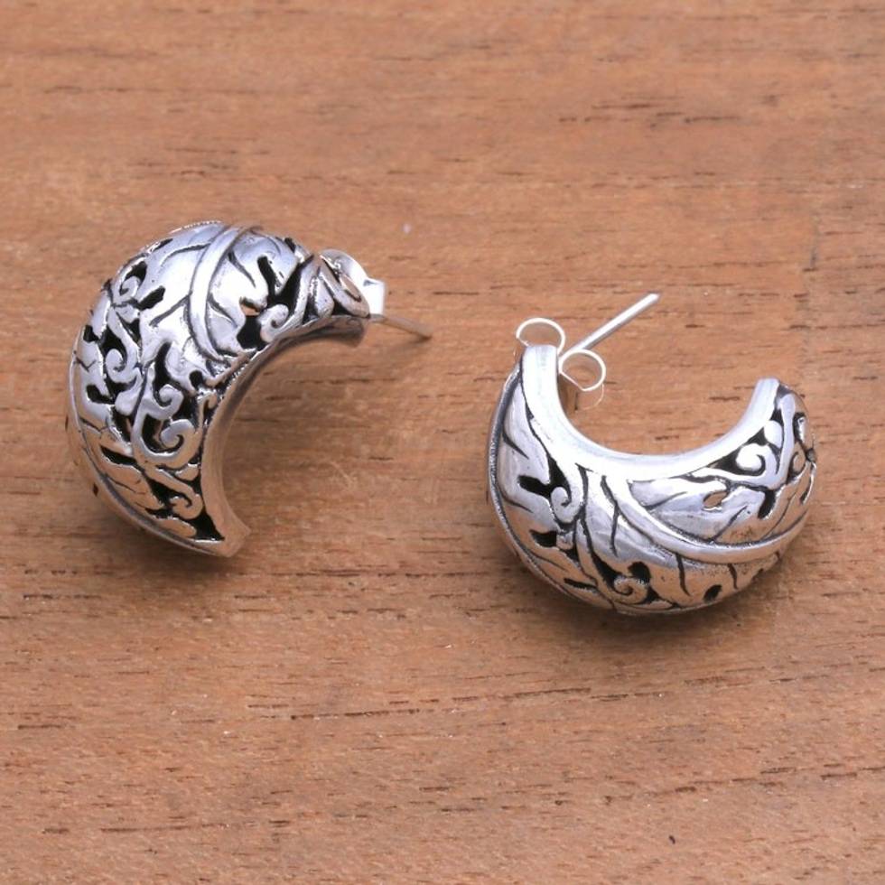 Leaf Motif Sterling Silver Half-Hoop Earrings from Bali 'Suspended Leaves' Item ID: 2671744973