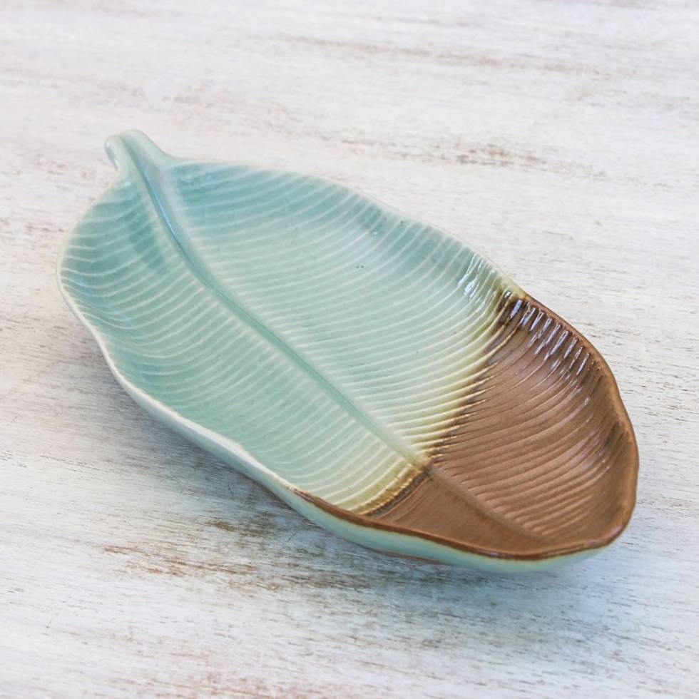 Leaf-Shaped Celadon Ceramic Platter from Thailand 'Nature Present' Item ID: 2669897251