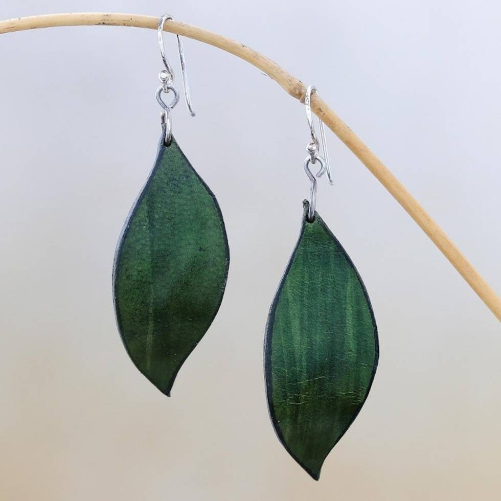 Leaf-Shaped Leather Dangle Earrings in Green from Thailand 'Fanciful Leaves in Green' Item ID: 2671641611