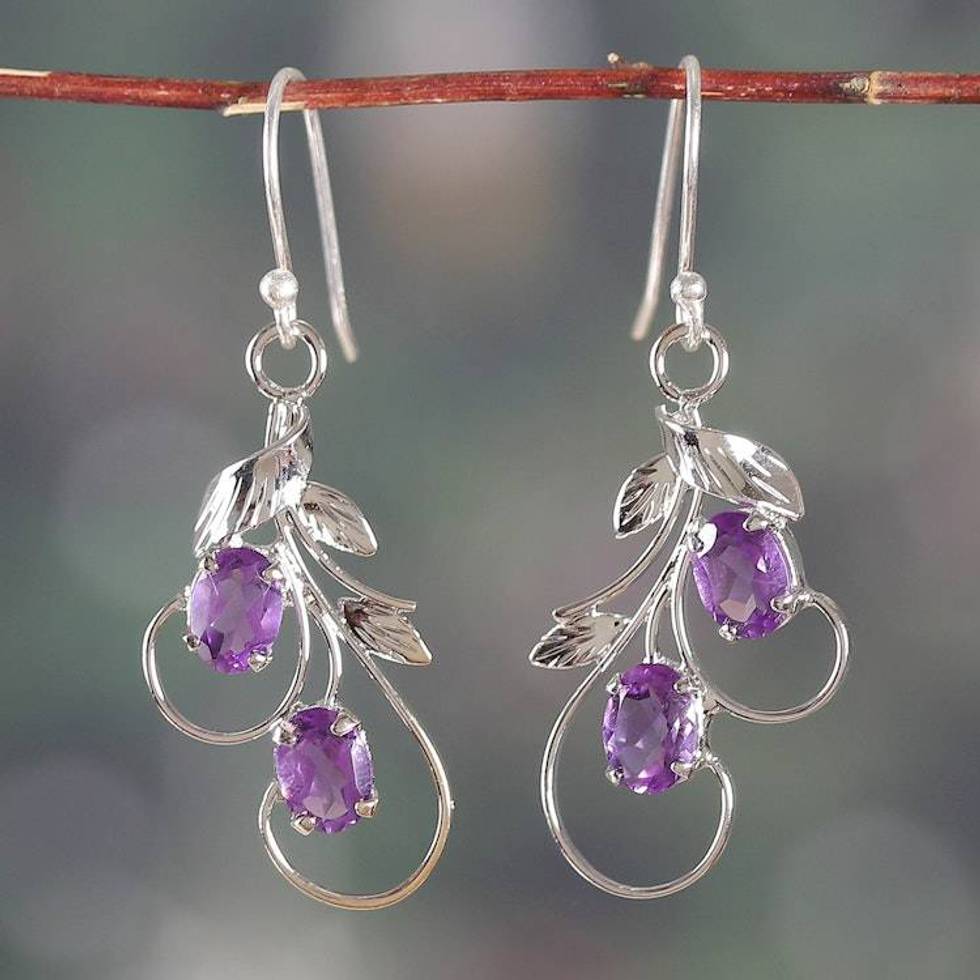 Leaf Tendril Nature-Inspired Amethyst Silver Dangle Earrings 'Passionate Leaves' Item ID: 2676664463