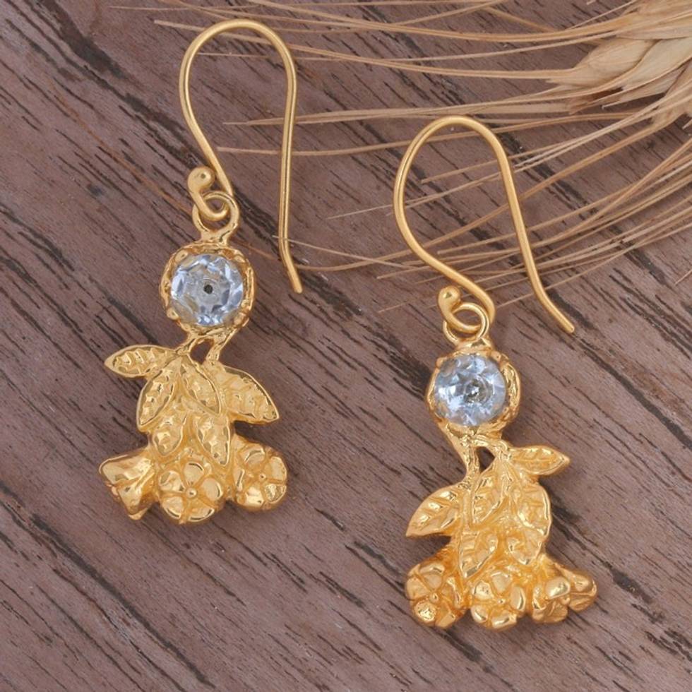 "Jewelry doesn't get any more glamorous than these sublime dangle earrings, featuring the loveliest topaz jewels and delicate leaf and floral details. The accessories are designed by Balinese artisan Ayu Puspita, who crafts them from 22k gold-plated sterling silver, allowing for a radiant look that enhances the gems, both totaling one carat."