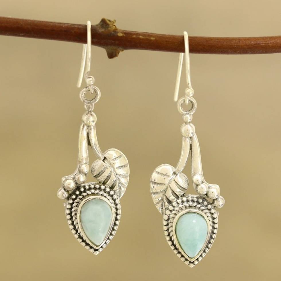 Leaf-Themed Larimar Dangle Earrings from India 'Caressed by Leaves' Item ID: 2671792856