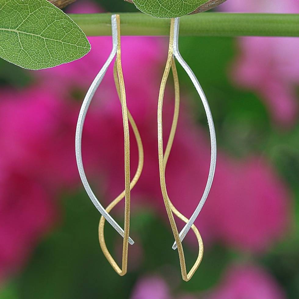 Leafy 18k Gold-Accented Sterling Silver Drop Earrings 'Golden Wilderness' Item ID: 2671646629