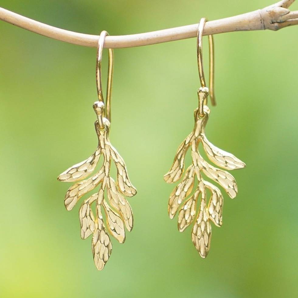 Leafy 18k Gold-Plated Brass Dangle Earrings from Bali 'Palatial Forest' Item ID: 2671763268