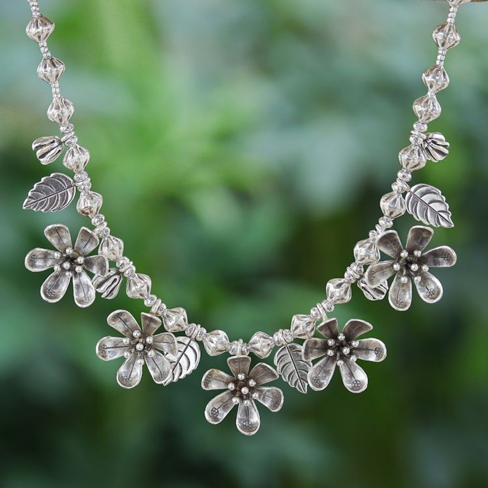 'Basket of Posies', necklace is unique and pretty. Too long for me, one knot solved problem. Eye Catching. Wear with 'Urban Love' earrings and 'Weaving Fantasies' ring, both by designer, Achara. Can also wear with large, 'Chiang Mai Rose' earrings by Achara. Price higher than other necklaces by Pakaon Sojintarit...may be because silver is 950. Solid, well made. Happy with purchase.